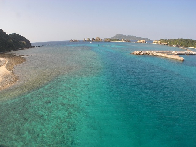フェリーが出入りする港のすぐ近くにある阿嘉大橋から見下ろした画像。