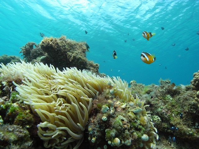 見られる魚はデバスズメダイ、クマノミ、ツノダシ、チョウチョウウオ各種、