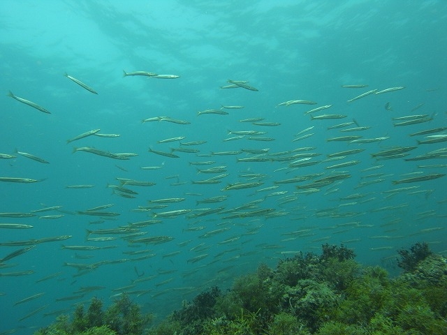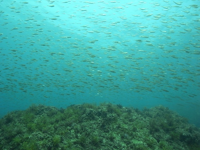 庄内ギンガメアジは島中を囲む勢いで群れています。