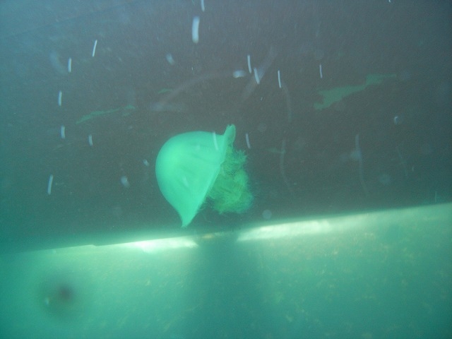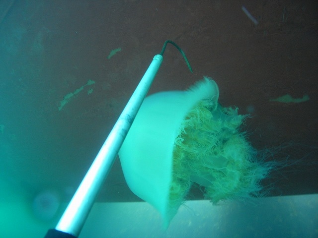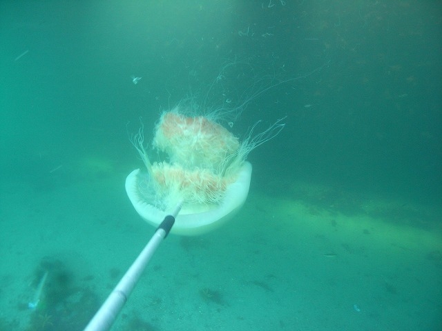 迷いながらも思い切りよくエチゼンクラゲの中心部にグサッと差込み