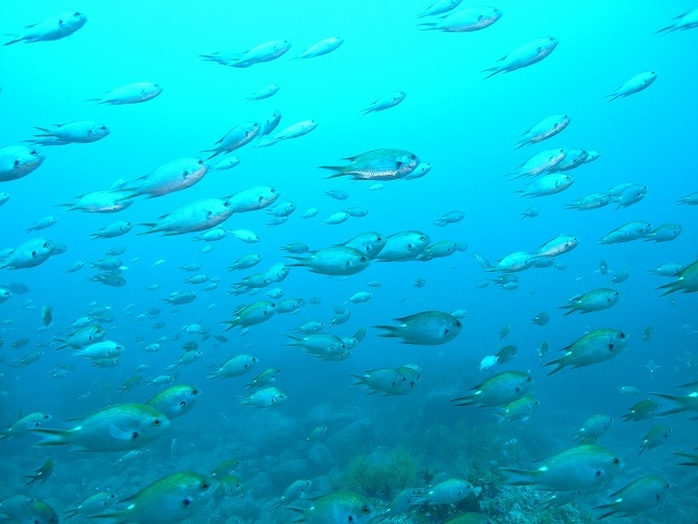 スズメダイの群れが華麗に水中を舞います。