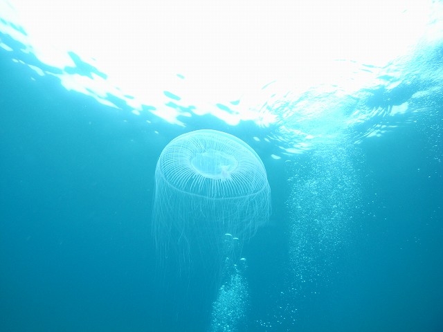 薄くて触手が髪の毛のように細く揺れるオワンクラゲが透明な海に映えます。